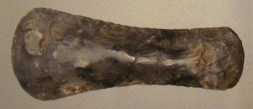 - On the piece of flint, try to identify a lump which would be easier to break off, normally on one end, and about twice the size you need the eventual axe to be